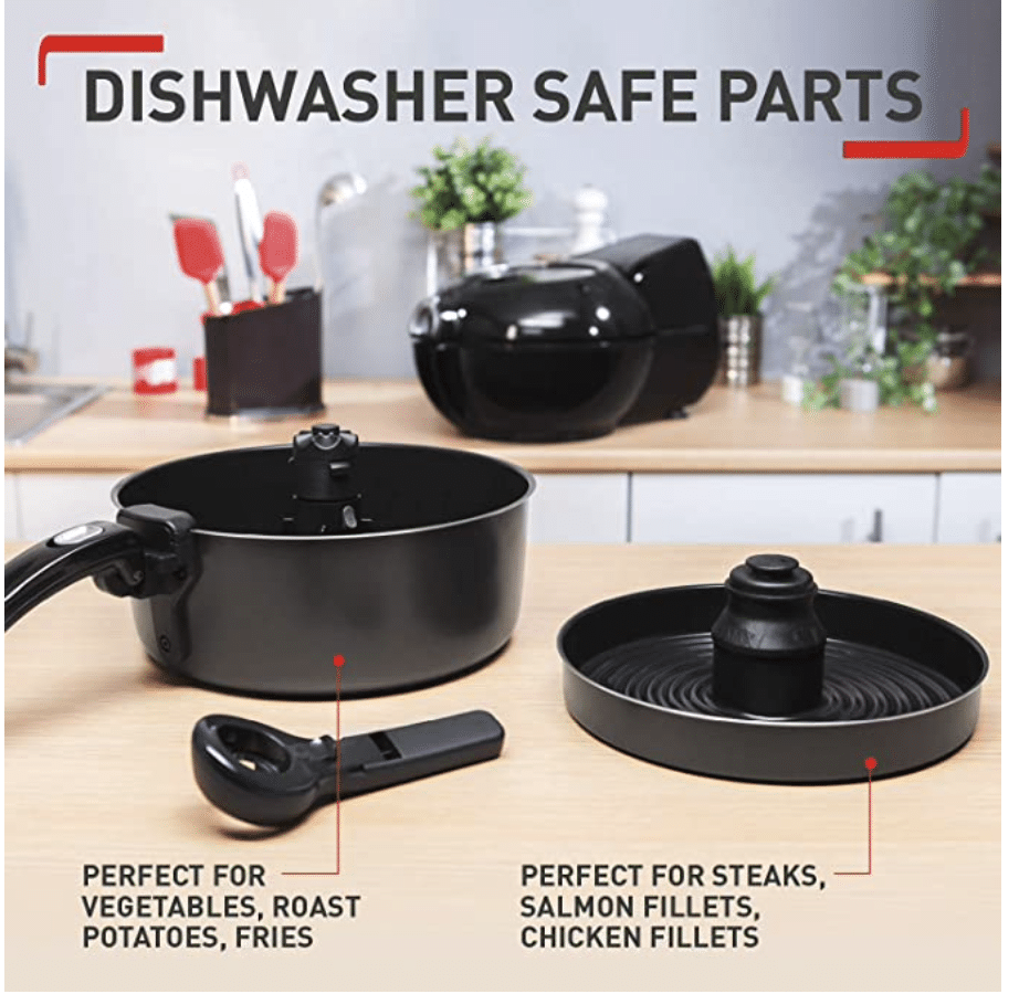 • Tự động dừng khi mở nắp, tất cả các bộ phận (bát, đĩa nướng, nắp ActiFry) đều có thể tháo rời và an toàn với máy rửa chén.