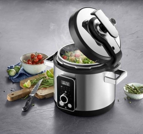 - Nồi điện áp suất điện WMF thanh lịch với vỏ Cromargan chất lượng cao là một cho tất cả mọi thứ, cho cả gia đình. Và do đó, công cụ toàn diện tạo điều kiện và tăng tốc các công việc nấu ăn hàng ngày trong hầu hết mọi hộ gia đình: với công suất 1100 watt, công suất tối đa 6 lít và 8 chương trình cài sẵn để nấu nhanh, nấu nhẹ và hấp, đun sôi, hâm nóng, nướng, rang và thậm chí là chuẩn bị gạo và cây họ đậu. Van an toàn và giảm áp và một con dấu đặc biệt đảm bảo an toàn tối đa, trong khi WMF Easy Xử lý với nút xoay / đẩy trực quan cho phép vận hành dễ dàng. Ngoài ra, nó có chức năng giữ ấm sáu giờ thuận tiện và cho phép nấu chậm đến mười hai giờ.
