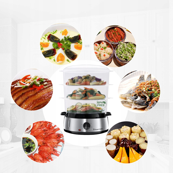 Nồi Hấp Điện 3 Tầng Russell Hobbs 19270-56 giúp bạn chế biến rất nhiều món ăn. Từ nấu cơm, đồ xôi cho đếp hấp hải sản, các loại rau của quả, thịt gia cầm,... Các món ăn chín mà không bị khô. Dinh dưỡng giữ lại hoàn toàn mà không bị ra nhước hay bay hơi, phản ứng hóa học như cách nấu thông thường. Màu sắc của thực phẩm cũng rất tự nhiên, không lo bị cháy.