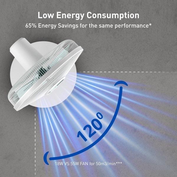 Tiết kiệm 65% năng lượng nhờ động cơ Effitech hoàn toàn mới của chúng tôi, có công suất tương đương với quạt 55W (Hiệu suất luồng khí được đo nội bộ, theo EN/IEC 60879:2019 và được đặt ở mức 50 m3/phút, so với VU5640F2).