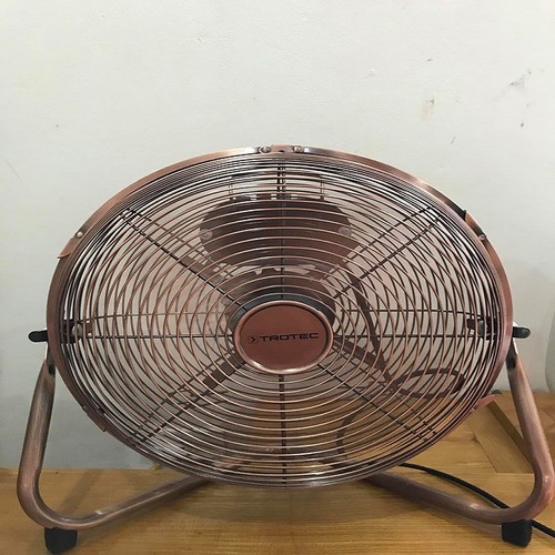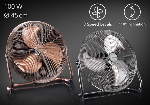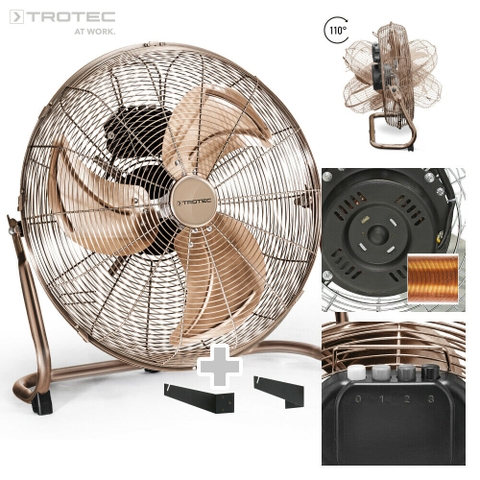 Quạt sàn Trotect TVM 17 gây ấn tượng với hệ thống quang học bằng đồng, thời trang và công suất mạnh 100 watt, có thể được điều chỉnh theo ba mức tốc độ. Quạt sàn mạ đồng Trotec TVM 17 được làm hoàn toàn bằng kim loại và chủ yếu là mạ đồng - ngay cả động cơ cũng được trang bị một cuộn dây đồng. Do được sản xuất chắc chắn, quạt được thiết kế để có tuổi thọ sử dụng lâu dài.