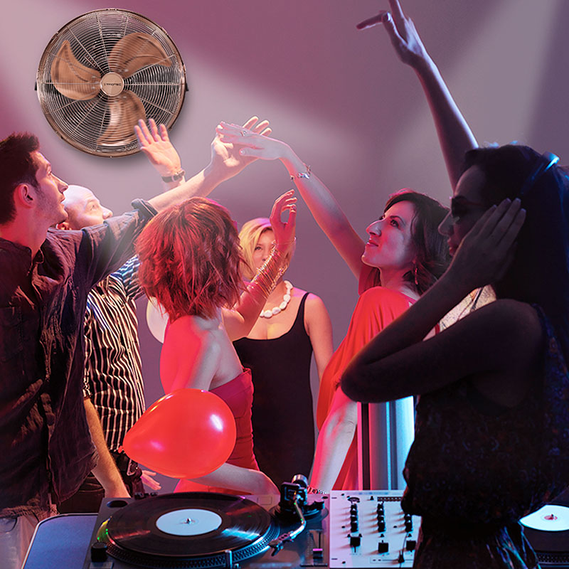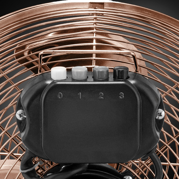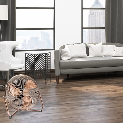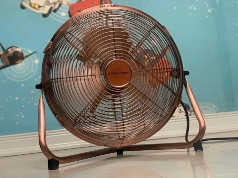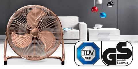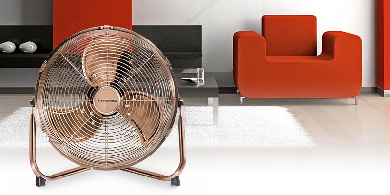 Quạt sàn Trotec TVM 17 thuyết phục với hệ thống quang học bằng đồng thời trang và công suất mạnh 100 watt, có thể được điều chỉnh theo ba mức tốc độ.