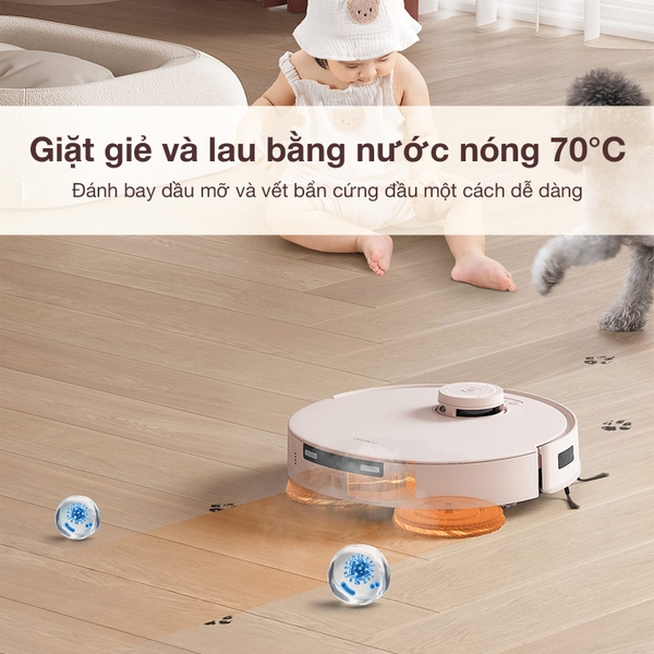 Robot hút bụi Ecovacs T30 Pro Omni tích hợp công nghệ giặt khăn lau nước nóng 70°C giúp loại bỏ vết bẩn và tiệt trùng hiệu quả. Kể cả khi lau bên trong nhà bếp, phòng ăn cũng sẽ dễ dàng loại bỏ vết dầu mỡ và những vết bẩn khó nhằn. Trong quá trình làm sạch, robot liên tục cung cấp nước nóng 70°C từ bình chứa, loại bỏ vết bẩn cứng đầu trên sàn nhà và tiêu diệt khuẩn.