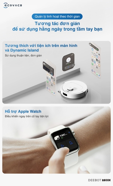 Đặc biệt, người dùng iPhone có thể tận dụng Dynamic Island để xem nhanh trạng thái hoạt động của robot. Khi mở rộng, cho phép bạn thực hiện các thao tác thường dùng một cách thuận tiện nhất. Ngoài ra, nếu bạn sở hữu Apple Watch, bạn cũng có thể theo dõi trạng thái hoạt động hoặc sử dụng các lệnh cơ bản như bắt đầu quá trình làm sạch hoặc yêu cầu robot quay về trạm sạc ngay trên cổ tay.