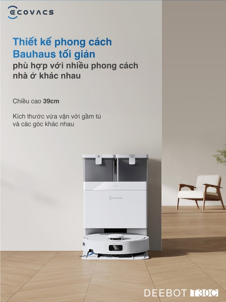 Lấy cảm hứng từ phong cách tối giản, robot Deebot T30C sở hữu ngoại hình tinh tế, sang trọng phù hợp với hầu hết không gian sống hiện đại. Thiết kế này vừa đảm bảo hiệu suất làm sạch tối ưu, vừa giữ được tính thẩm mỹ cho không gian nội thất. Đặc biệt, việc đổ nước bẩn, thêm nước sạch vào bình chứa rất thuận tiện, bạn chỉ cần nâng nhẹ bình lên 5cm, mà không cần phải di chuyển toàn bộ trạm sạc.