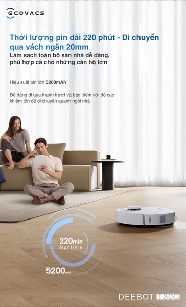 Robot hút bụi lau nhà Ecovacs Deebot T30C trang bị viên pin dung lượng lớn 5200mAh hoạt động liên tục đến 220 phút chỉ với 1 lần sạc đầy (Theo kết quả phòng thí nghiệm Ecovac, thời gian làm thực tế có thể thay đổi). Điều này đảm bảo quá trình làm sạch không bị gián đoạn, cho phép robot dọn dẹp một khu vực rộng lớn và không bỏ sót bất kỳ vết bẩn nào, đồng thời giảm số lần bạn cần sạc pin cho robot.
