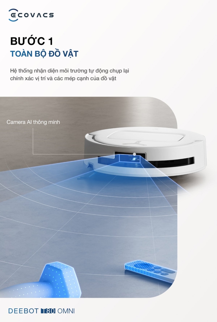 Được tích hợp công nghệ AIVI 3D 3.0 Omni-Approach, hệ thống tiên tiến giúp robot lên kế hoạch dọn dẹp hiệu quả và thông minh. Công nghệ AIVI 3D 3.0 Omni-Approach sử dụng mô hình VLM và mạng nơ-ron học sâu, được đào tạo chuyên sâu để nhận diện chính xác các đối tượng và nhanh chóng xác định đường viền của chúng, để đảm bảo làm sạch sát các cạnh mà vẫn tránh va chạm. Camera AI thông minh, Công nghệ TrueDetect ánh sáng cấu trúc 3D phía trước hoạt động đồng bộ với cảm biến TruEdge 3D Edge Sensor, cho phép robot hút bụi Ecovacs Deebot T80 Omni luôn giữ khoảng cách gần với các chướng ngại vật khi làm sạch các cạnh, đạt độ bao phủ tối đa.