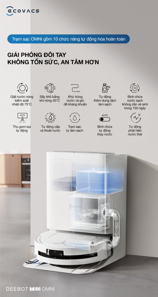 Robot hút bụi Ecovacs T80 Omni - Trạm OMNI nhỏ gọn, mạnh mẽ rảnh tay hơn bao giờ hết