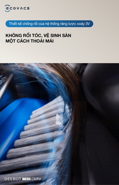 Chổi chính với cấu trúc 3 hình chữ V nghiêng 45°, một thiết kế thông minh giúp ngăn chặn tóc bị mắc kẹt. Chổi chính dạng xoắn ốc kết hợp cùng răng lược đảm bảo quá trình gỡ lông tóc diễn ra suôn sẻ. Nhờ vậy, bạn có thể tận hưởng lực hút mạnh mẽ, dễ dàng bảo trì và luôn có sàn nhà sạch bóng với robot hút bụi lau nhà Ecovacs T80 Omni.