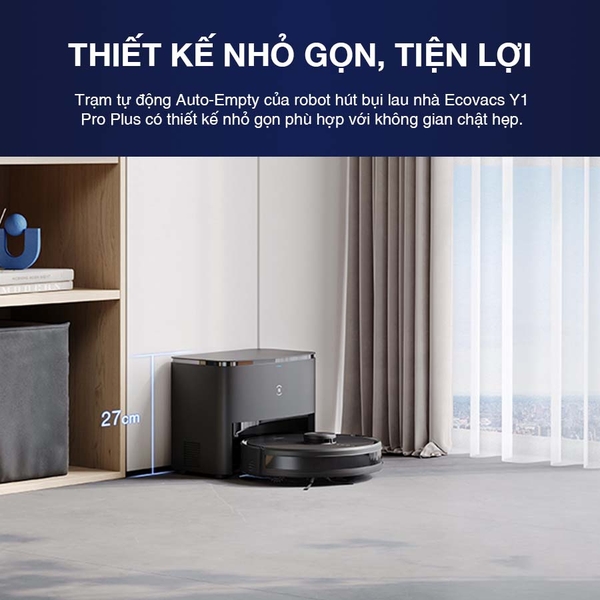 Trạm tự động Auto-Empty của robot hút bụi lau nhà Ecovacs Y1 Pro Plus có thiết kế nhỏ gọn phù hợp với không gian chật hẹp, có chiều cao 27cm tương đương với một chai nước khoáng cho phép người dùng dễ dàng đặt ở nhiều không gian nội thất khác nhau để cất giữ thuận tiện. Đồng thời, bạn cũng có thể di chuyển trong không gian hẹp với chiều rộng thân máy 33cm, tạo điều kiện làm sạch hiệu quả ở những khu vực chật hẹp.