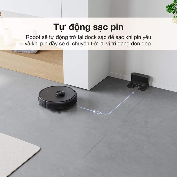 Khi pin yếu hoặc hoàn thành quá trình lám sạch, robot sẽ tự động trở về dock sạc để sạc pin. Nếu nó đang bỏ dở vị trí nó sẽ nhớ và quay lại hoàn thành phần công việc khi pin được sạc đủ lượng pin.