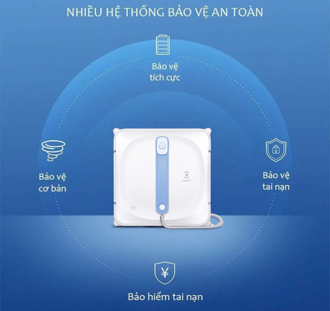 Tuy khả năng robot bị rơi khỏi bề mặt kính là thấp nhưng nó vẫn được thiết kế với một chốt hút và cáp an toàn có độ đàn hồi cao cũng như carabiner chịu lực rất tốt (có thể chịu được lực 80 kg) cũng đảm bảo an toàn cho thiết bị. Trang bị đầy đủ các hệ thống bảo vệ an toàn giúp robot vận hành suôn sẻ, không gặp các trở ngại về độ cao. Do đó, người dùng sẽ yên tâm trong quá trình sử dụng robot lau kính Winbot W920.
