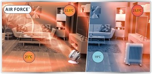 Làm nóng không gian nhanh hơn và đồng đều hơn với mức tiêu thụ năng lượng thấp hơn và thoải mái hơn so với bộ tản nhiệt cổ điển. Thử nghiệm so sánh giữa máy sưởi dầu BU2620 và máy sưởi đối lưu CO3030 so với Air Force Hot & Cool với cùng nguồn cung cấp 1.200 Wh trong phòng 20 mét vuông.