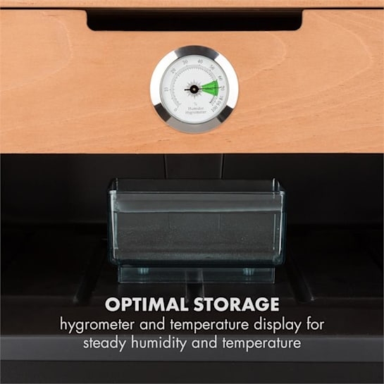 • Tủ được tích hợp máy đo độ ẩm cùng bình chứa nước giúp duy trì độ ẩm tương đối lý tưởng 70%, vì vậy xì gà không bị khô cũng như giữ được mùi, hương vị trong thời gian dài.