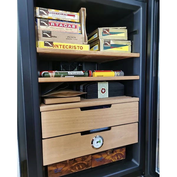 • Với thể tích 65 lít với 4 kệ gỗ và hai ngăn kéo trên ray, 12 kệ trên ray với khoảng cách 4 cm mỗi ngăn có thể lưu trữ từ 1.000 đến 6.500 điếu Cigar.