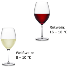 + 16 - 17°C: Rượu vang đỏ trẻ trung, phong phú, ví dụ Pinot Noir, Dornfelder, Lemberger hoặc đỏ Bordeaux, Chianti, Vino Nobile, Blaufränkisch, Zweigelt màu xanh.