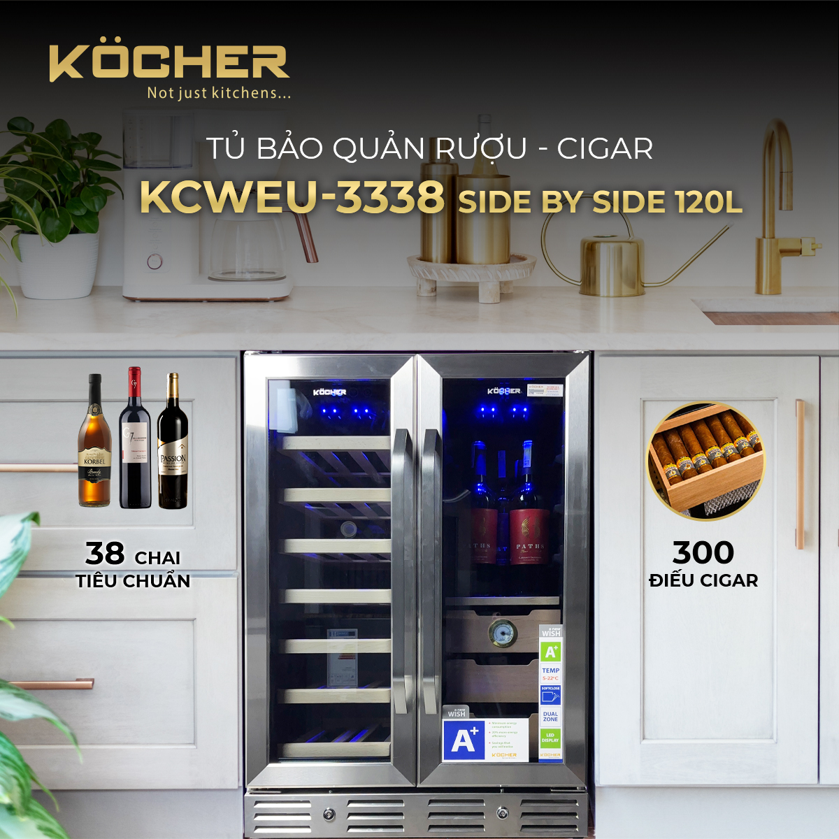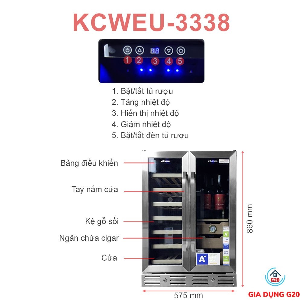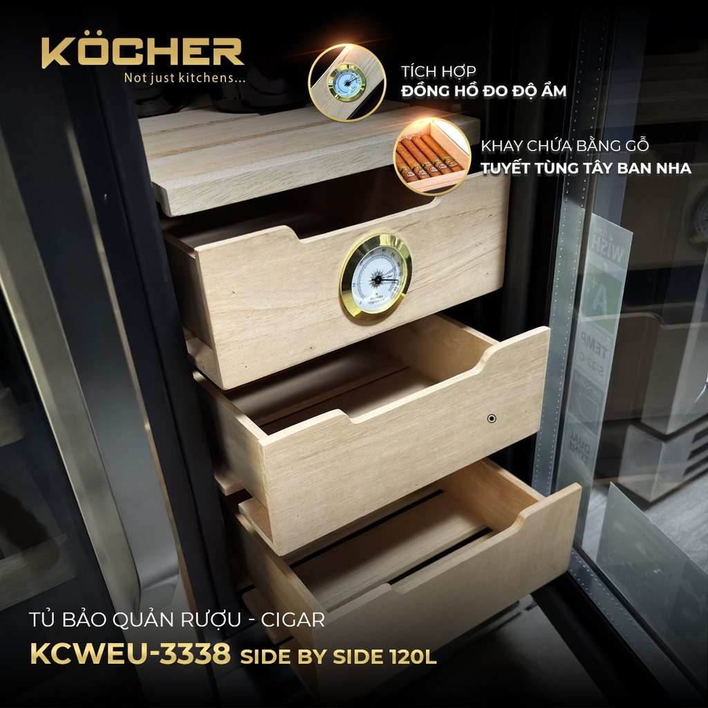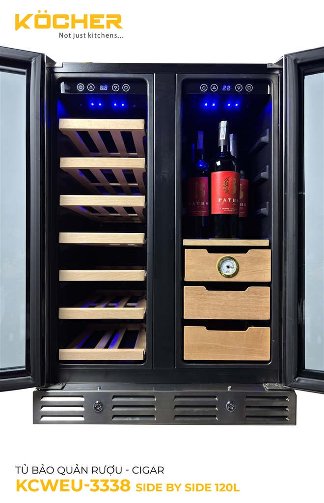 Thông số kỹ thuật chi tiết Tủ bảo quản Rượu vang – Cigar Side by side KOCHER KCWEU-3338, Dung tích 120 lít , màu Inox