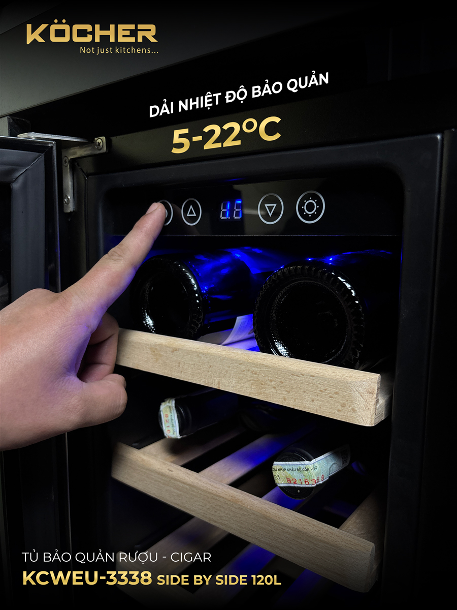 Tủ bảo quản rượu - cigar side by side Kocher KCWEU-3338 được thiết kế với 2 ngăn bảo quản độc lập, cho phép điều chỉnh nhiệt độ từ 05°C đến 22°C. Nhờ đó, người dùng có thể bảo quản rượu vang và cigar trong cùng một thiết bị mà vẫn đảm bảo mỗi loại có điều kiện lý tưởng riêng biệt. Rượu vang luôn đạt đến độ chín hoàn hảo, còn cigar được giữ nguyên hương vị và độ ẩm chuẩn mực.