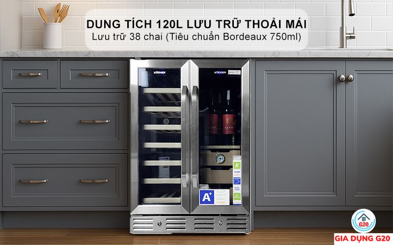 Với dung tích 120L, tủ bảo quản rượu - cigar side by side Kocher KCWEU-3338 mang đến khả năng lưu trữ lên đến 38 chai rượu (theo tiêu chuẩn Bordeaux 750ml), đáp ứng nhu cầu bảo quản một lượng rượu vừa phải cho các gia đình, quán rượu hoặc những người yêu thích sưu tầm rượu vang.