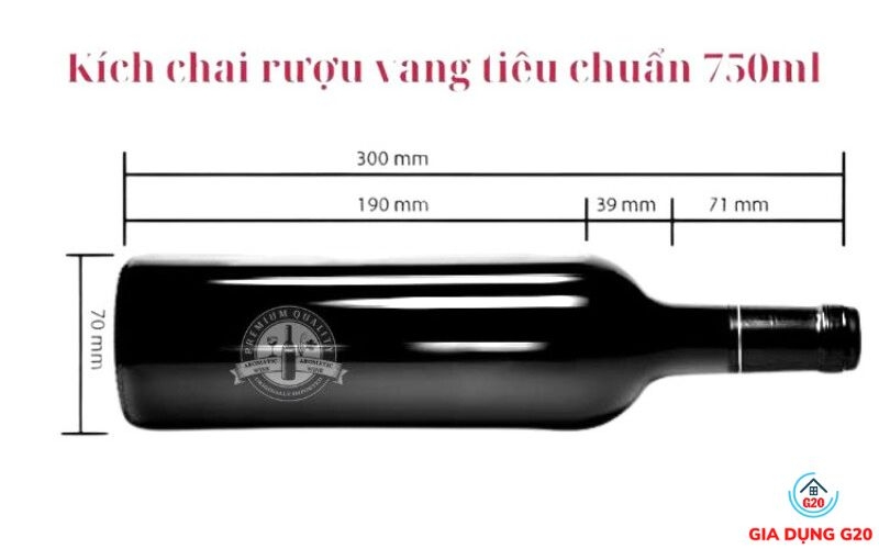 Tủ rượu sử dụng chai rượu vang Bordeaux tiêu chuẩn dung tích 750ml có kích thước rất đặc trưng và phổ biến. Chiều cao tổng thể của chai là 300mm, với đường kính thân chai đạt 70mm. Phần thân chai chính, nơi chứa hầu hết rượu, có chiều dài là 190mm. Đây là kích thước tiêu chuẩn được sử dụng rộng rãi trên toàn thế giới cho dòng vang Bordeaux.