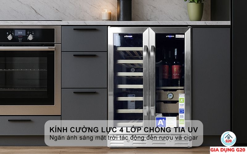 Tủ bảo quản rượu - cigar side by side Kocher KCWEU-3338 sử dụng kính cường lực 4 lớp cao cấp, có khả năng chống tia UV hiệu quả, ngăn ánh sáng mặt trời tác động đến rượu và cigar. Nhờ đó, hương vị và cấu trúc sản phẩm luôn được giữ trọn vẹn, không bị biến đổi theo thời gian. Thiết kế kính nhiều lớp còn giúp tăng độ bền, khả năng cách nhiệt tốt, giảm tối đa sự ảnh hưởng từ môi trường bên ngoài.