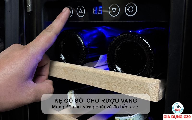 Ngăn làm mát rượu vang bao gồm 7 kệ gỗ sồi tự nhiên, không chỉ bền chắc mà còn giúp bảo quản rượu trong điều kiện tốt nhất. Gỗ sồi còn tạo cảm giác ấm áp, nâng cao tính thẩm mỹ cho toàn bộ khoang tủ. Bên cạnh đó, kệ gỗ còn hạn chế rung động, giữ cho chai rượu ở trạng thái ổn định tuyệt đối.