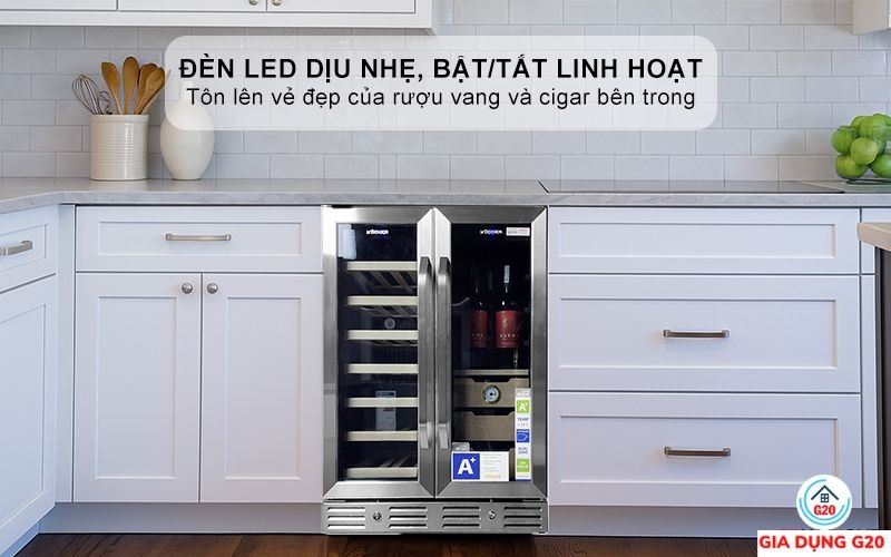 Khoang tủ được tích hợp đèn LED ánh sáng dịu nhẹ, vừa giúp quan sát dễ dàng, vừa tôn lên vẻ đẹp của rượu vang và cigar bên trong. Người dùng có thể bật/tắt linh hoạt tùy nhu cầu. Đặc biệt, ánh sáng LED không tỏa nhiệt, không gây ảnh hưởng đến chất lượng rượu và cigar. Nhờ đó, sản phẩm bên trong luôn được trưng bày đầy tinh tế mà vẫn đảm bảo điều kiện bảo quản tối ưu.