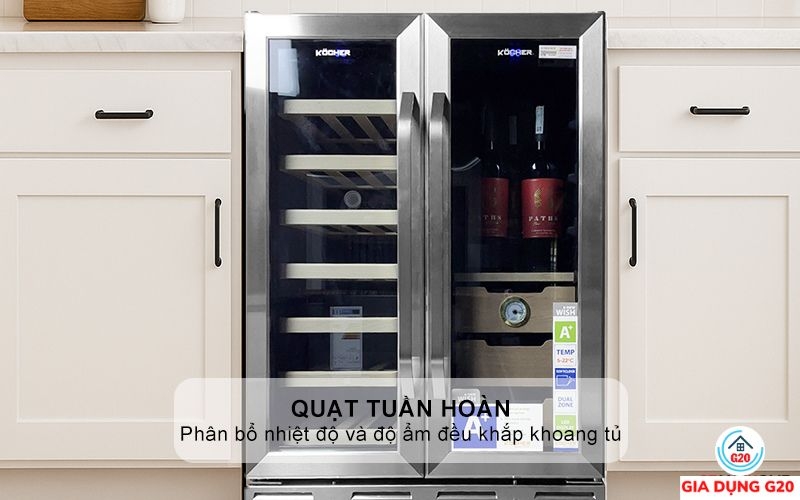 Hệ thống quạt tuần hoàn thông minh giúp phân bổ nhiệt độ và độ ẩm đều khắp khoang tủ. Nhờ đó, rượu vang và cigar luôn được bảo quản trong môi trường ổn định, hạn chế tối đa sai lệch. Cơ chế này còn giảm tình trạng ẩm mốc hoặc khô cứng không mong muốn, đảm bảo chất lượng bảo quản hoàn hảo. Đây là yếu tố làm nên sự khác biệt của Kocher so với các dòng tủ thông thường.