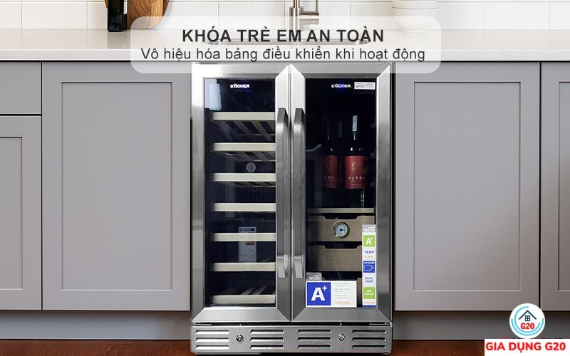 Chức năng khóa an toàn trẻ em giúp ngăn ngừa tình trạng mở tủ ngoài ý muốn và đảm bảo an toàn tuyệt đối cho trẻ nhỏ trong gia đình. Tính năng này không chỉ bảo vệ các bé khỏi những rủi ro khi tiếp xúc với thiết bị điện mà còn giữ an toàn cho những chai rượu quý giá, tránh va chạm hoặc hư hỏng không mong muốn. Với sự trang bị thông minh này, người dùng hoàn toàn yên tâm khi đặt tủ rượu trong bất kỳ không gian sinh hoạt nào.