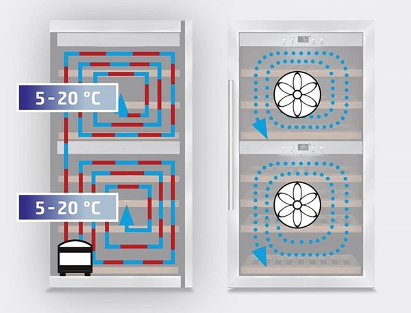 - Hai vùng nhiệt độ riêng biệt, có thể điều chỉnh riêng cho rượu vang trắng và đỏ.