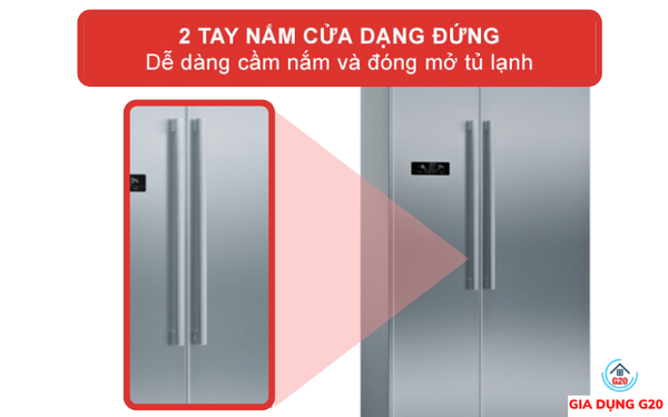 Ngoài ra, cánh cửa tủ còn được trang bị thêm 2 tay nắm cửa dạng đứng bằng nhôm dọc. Giúp cho người dùng khi sử dụng tủ lạnh có thể dễ dàng cầm nắm để đóng mở cửa tủ.