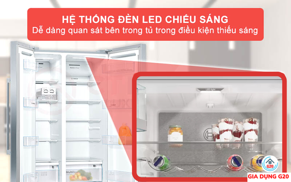 Bên trong khoang tủ lạnh Bosch KAN93VIFPG được trang bị thêm đèn LED chiếu sáng đồng đều. Người dùng sẽ dễ dàng quan sát bên trong khoang tủ khi bị thiếu ánh sáng lúc cho thực phẩm vào bảo quản.