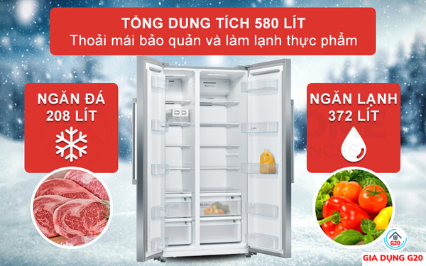 Tổng dung tích đến 580 lít cho bạn thoải mái bảo quản và làm lạnh thực phẩm