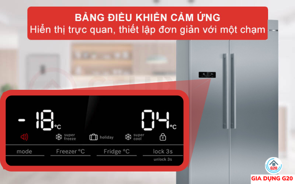 Bảng điều khiển của tủ lạnh Bosch KAN93VIFPG cảm ứng một chạm để thuận tiện tùy chỉnh nhiệt độ. Có thiết kế tối giản để cài đặt làm lạnh tủ một cách dễ dàng. Điều này giúp người dùng sử dụng được những tiện ích của tủ lạnh đem lại một cách nhanh chóng. Đồng thời kiểm soát được mức nhiệt trong tủ lạnh Bosch KAN93VIFPG.