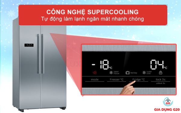 Khi kích hoạt công nghệ SuperCooling trong Tủ Lạnh Side By Side Bosch KAN93VIFPG Series 4. Khiến cho nhiệt độ bên trong tủ hạ xuống một cách nhanh chóng với mức thấp nhất là 2°C. Giúp thực phẩm bên trong tủ sẽ được làm lạnh một cách nhanh chóng. Chức năng này sẽ tự động chuyển về nhiệt độ ban đầu sau khoảng 6 giờ. Như vậy sẽ tiết kiệm được điện năng cho người dùng.