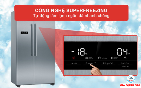 Tủ lạnh Bosch KAN93VIFPG sử dụng công nghệ Superfreezing sẽ giúp đông lạnh nhanh chóng thực phẩm cần bảo quản. Điều này giúp thực phẩm của bạn tránh sự rã đông không cần thiết khi bạn cho thêm thực phẩm mới vào. Đồng thời, thức ăn mới cũng sẽ được cấp đông một cách nhanh chóng để giữ được độ tươi, dinh dưỡng và hương vị quan trọng.