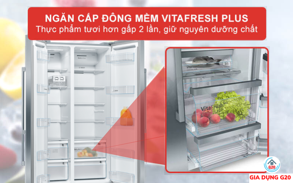 Tủ lạnh Bosch KAN93VIFPG có chứa ngăn đông mềm VitaFresh Plus mang đến cho người dùng nhiều tiện ích trong quá trình muốn giã đông thực phẩm. Mà vẫn giữ được độ tươi ngon không bị mất nước khi dùng các biện pháp rã đông thông thường. Nên VitaFresh Plus vừa cung cấp không gian chứa rộng rãi hơn và đây còn là công nghệ bảo quản tối ưu.