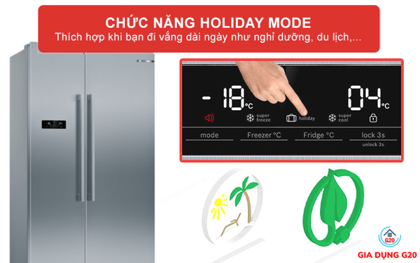 Tủ lạnh Bosch KAN93VIFPG với chức năng Holiday Mode một khi đã được kích hoạt. Thì nhiệt độ bên trong ngăn mát sẽ ở mức +14°C và ngăn đá là -18°C. Điều này giúp thực phẩm vẫn giữ lạnh ở nhiệt thích hợp và ngăn lãng phí điện năng hơn.