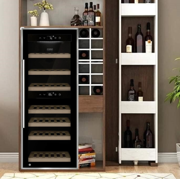 Hai vùng nhiệt độ được điều chỉnh riêng. Do đó lý tưởng để lưu trữ rượu vang trắng và đỏ cùng một lúc, chẳng hạn như rượu sủi tăm, nước chanh hoặc nước cũng có thể được lưu trữ trong Tủ rượu Caso 2 tầng cao cấp.
