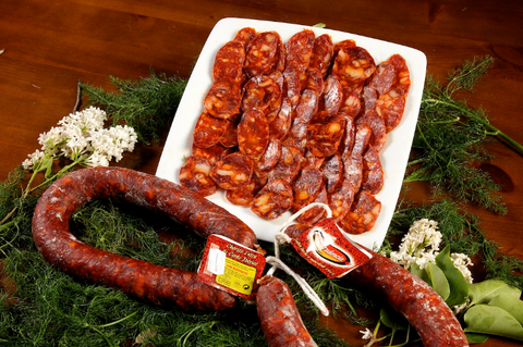 Xúc xích Chorizo từ thịt lợn đen ăn quả sồi và ngũ cốc được ướp với tỏi, bột ớt paprika, muối, thảo mộc ủ 4 tháng trong quá trình sấy khô tự nhiên. Loại này có vị đặc biệt Ngọt và Cay. Trọng lượng 400gr